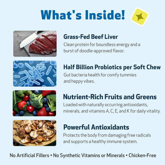 Nutrient-rich morsels for all Doodles with a burst of meaty flavor in every bite! Wholesome bone broth for collagen support Vibrant medley of antioxidant-rich fruits Nutritious and fortifying dark green veggies A flavor bomb of ethically-sourced, grass-fed beef liver Half a Billion CFU of Probiotics...
