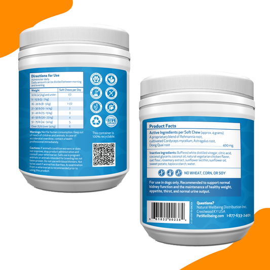 Supports healthy and stable kidney function and maintenance of: Normal urine output and thirst (fluid balance) Healthy appetite and weight General vitality and energy Healthy immune function Order Kidney Support Chewies today and help your dog maintain healthy kidneys and a better quality of life! 90 soft chews...