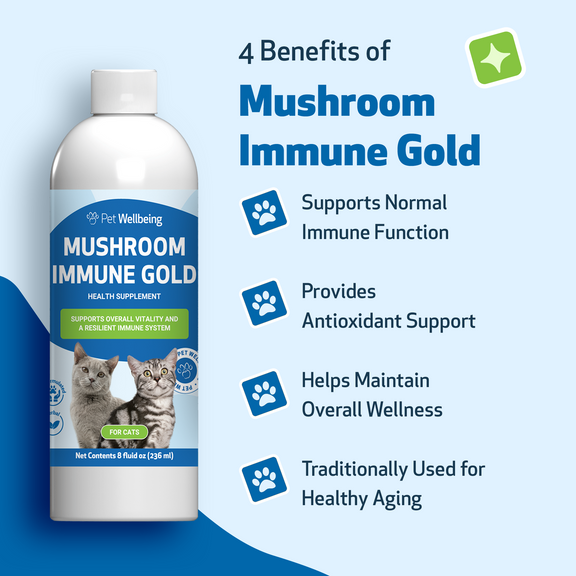 Explore the immune-supporting benefits of Mushroom Immune Gold today and nurture your cat’s quality of life!