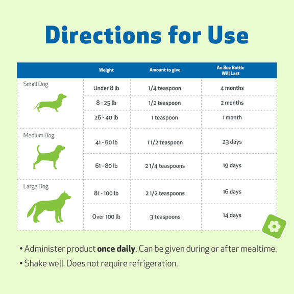 - 8 oz (236 ml) bottle is a 2-to-4-month supply for small-medium dogs and 1-month supply for most large dogs